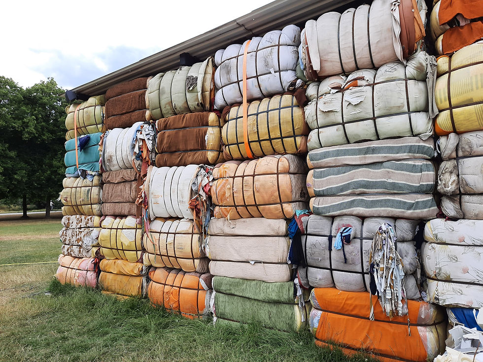 Auf der Karlswiese eine aus Stoffballen errichtete Halle. Die Stoffballen sind unsere Stoffabfälle, die wir (in guter Absicht) als Alt-Kleider in die Welt schicken. Und die dort "in der Welt" eigentlich nur Unheil anrichten und die heimische Textilindustrie zerstören.